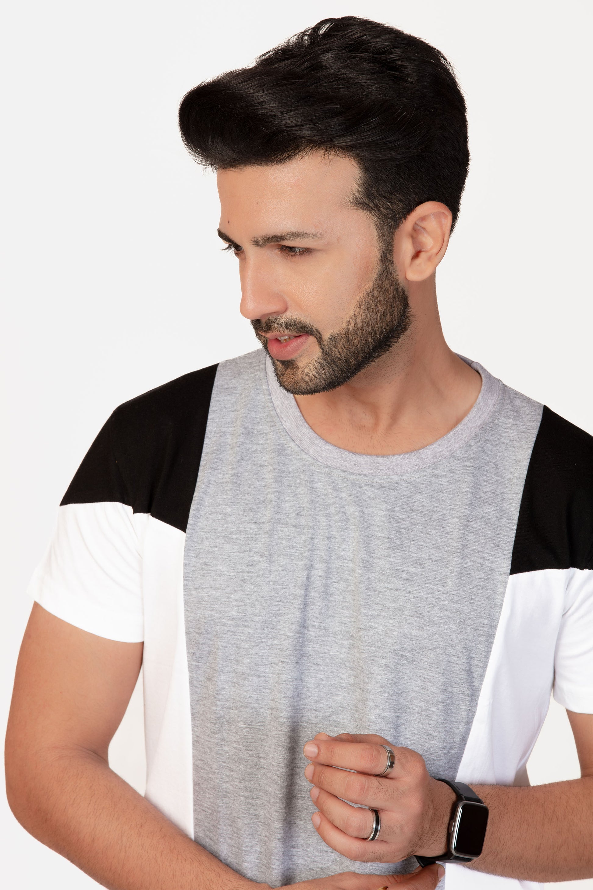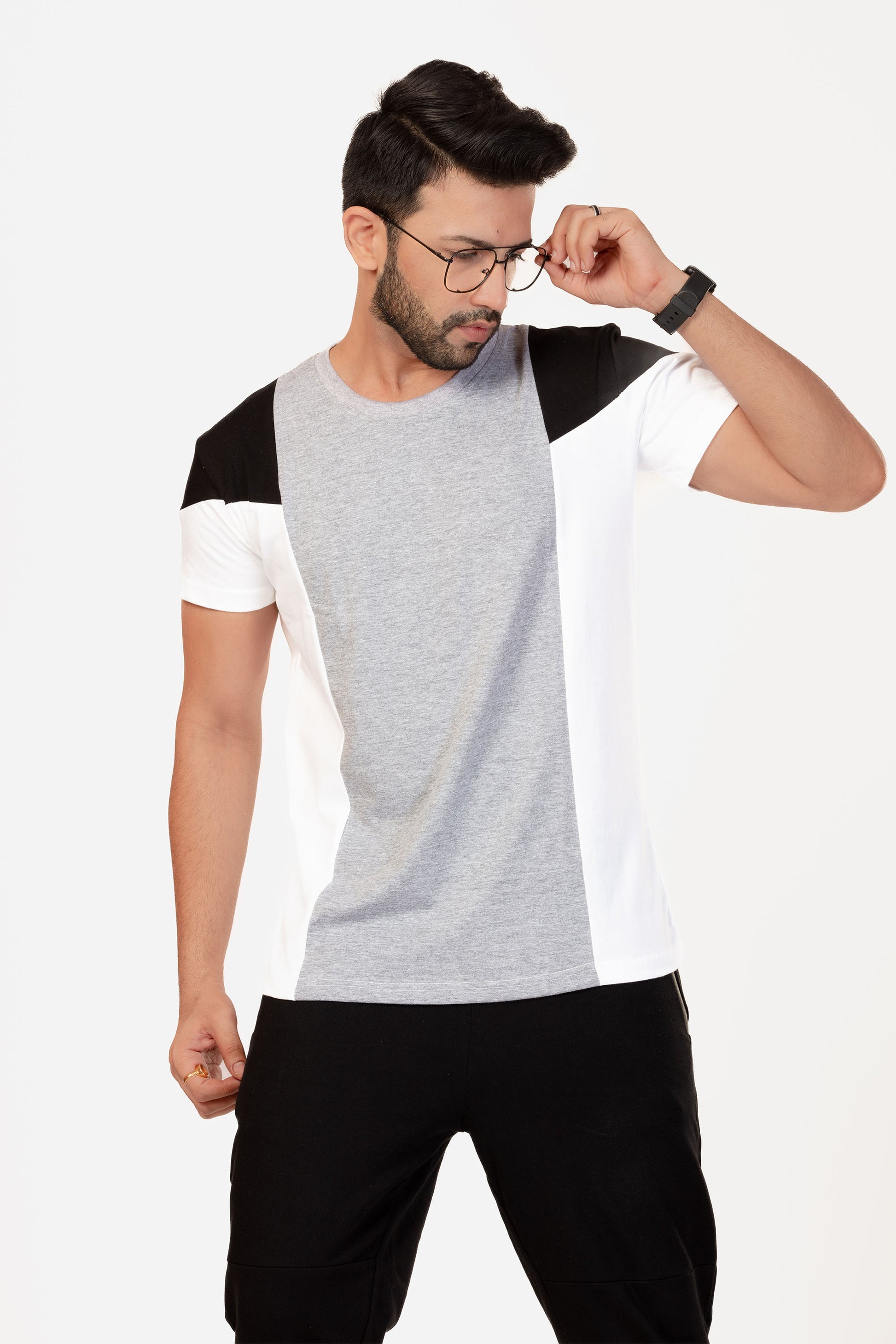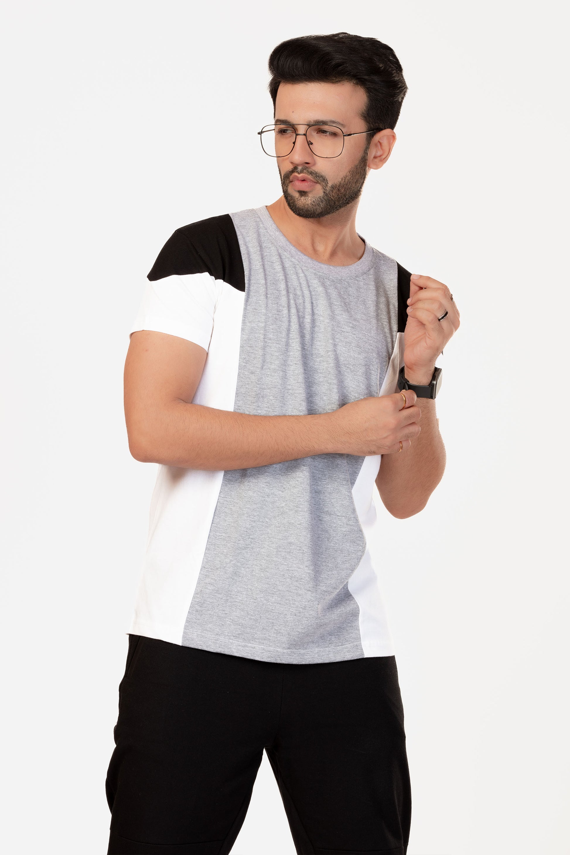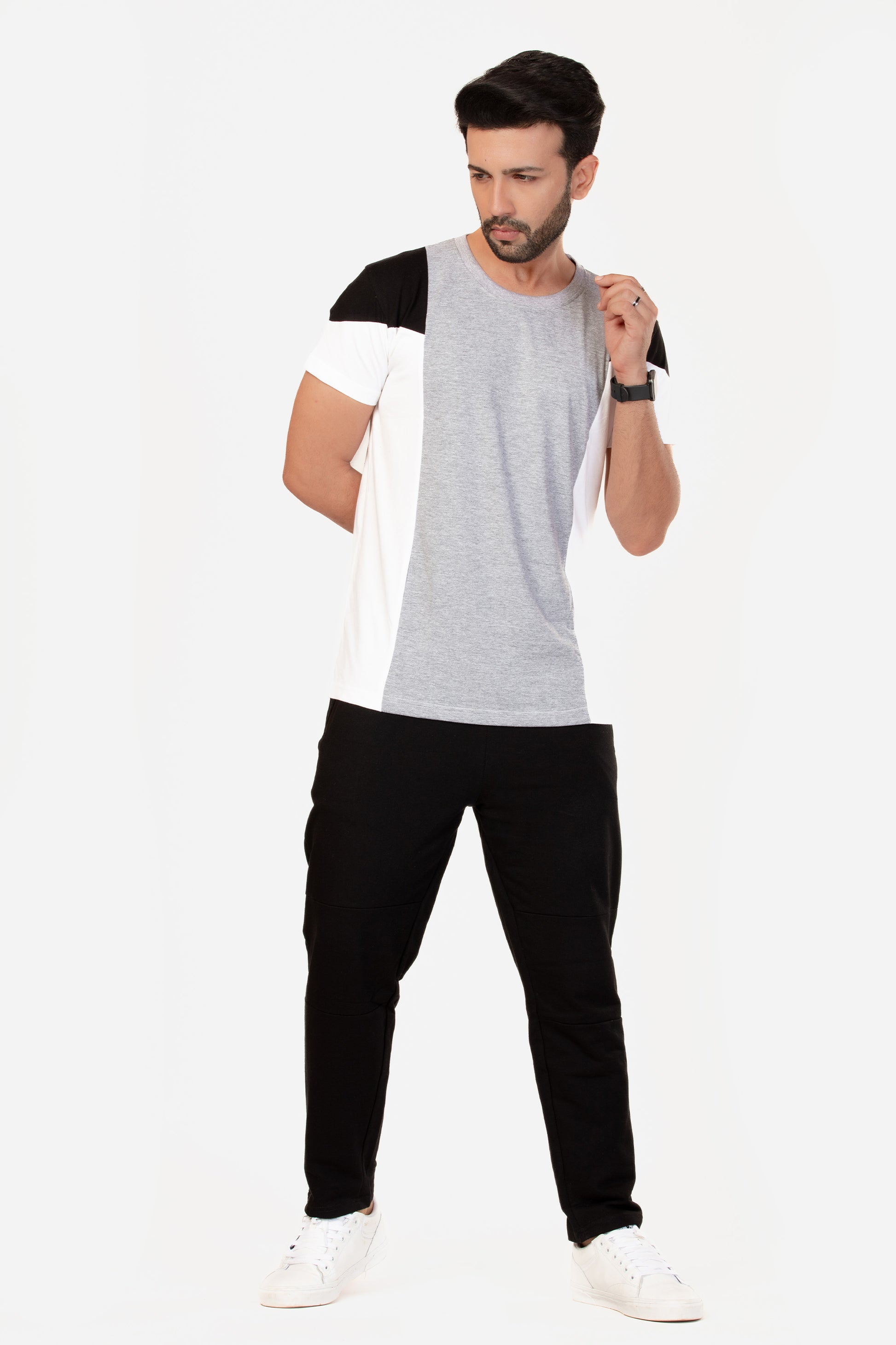 • Design : Grey & White Panels with Black Shoulder Panel, Regular Fit