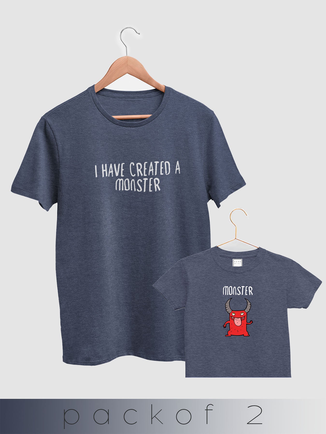 Colour-coordinated tees for the Keos family. This set includes two T-shirts—one printed “I have created a monster” for the adult and one printed “Monster” for your mini, featuring a playful red monster graphic on heather green.